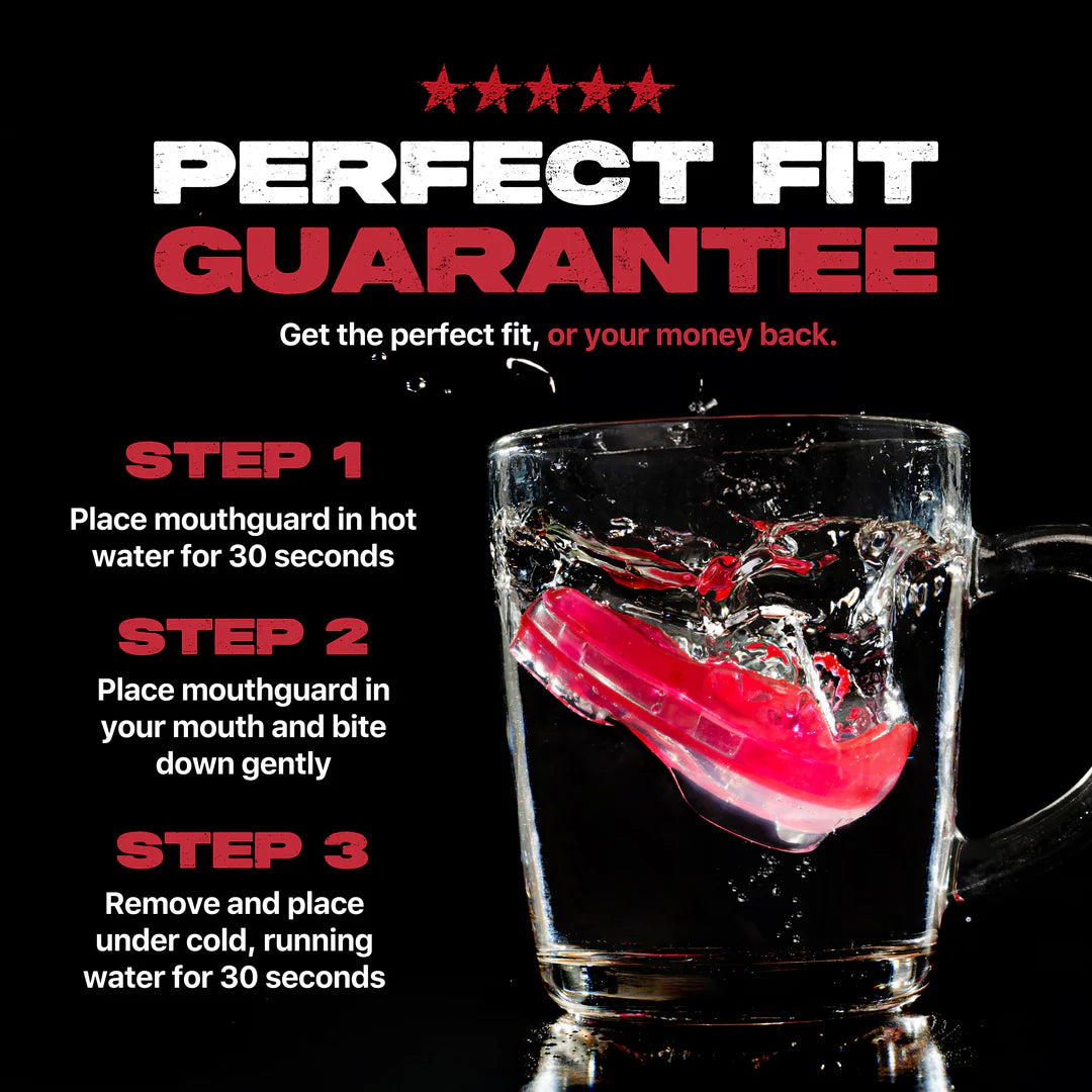 FluidFit™: Gum shields can be uncomfortable and bulky, especially when worn with braces! With our self-fit mouthguards (Boil and Bite), we have engineered a specific grade of EVA that when heated becomes pliable enough to fill the contours of the mouth, but hardens when cooled again to offer ample protection. It ensures the mouthguard fits like a glove and feels comfortable and unobtrusive when worn.