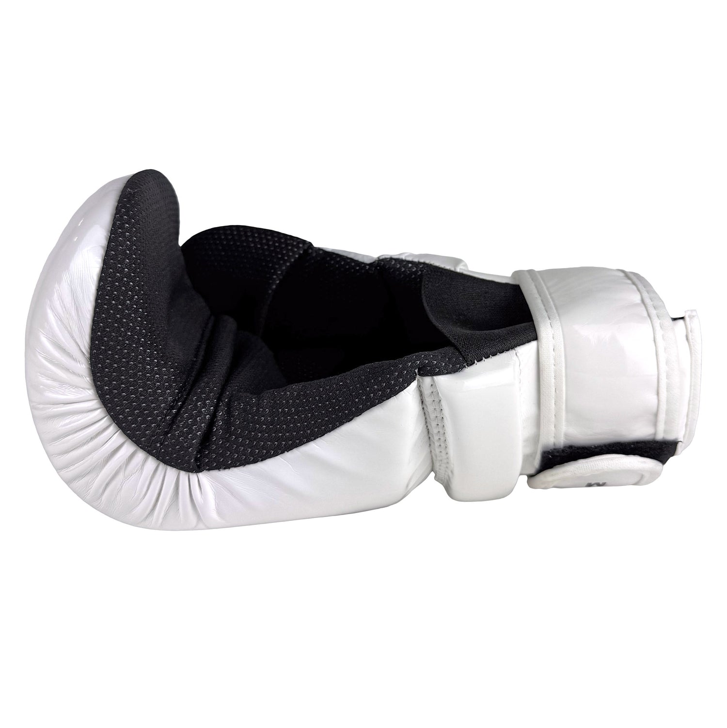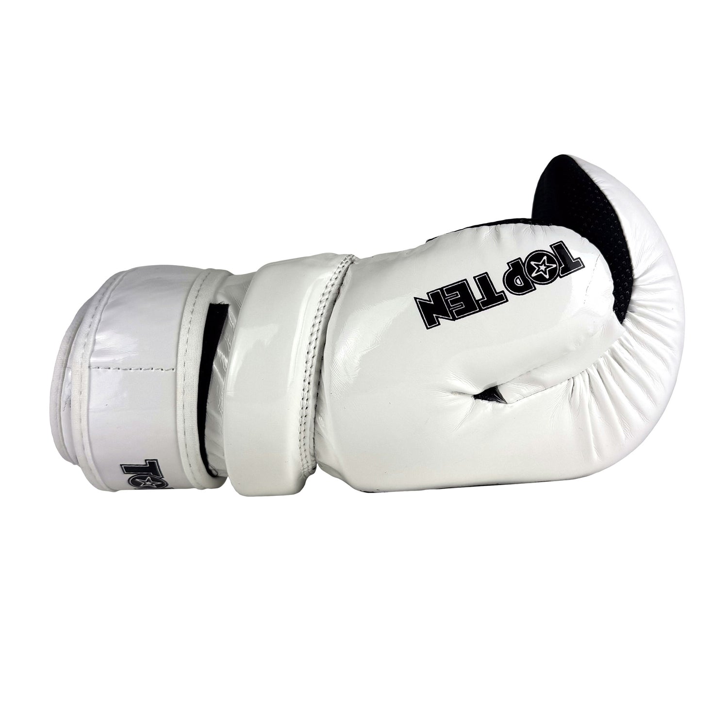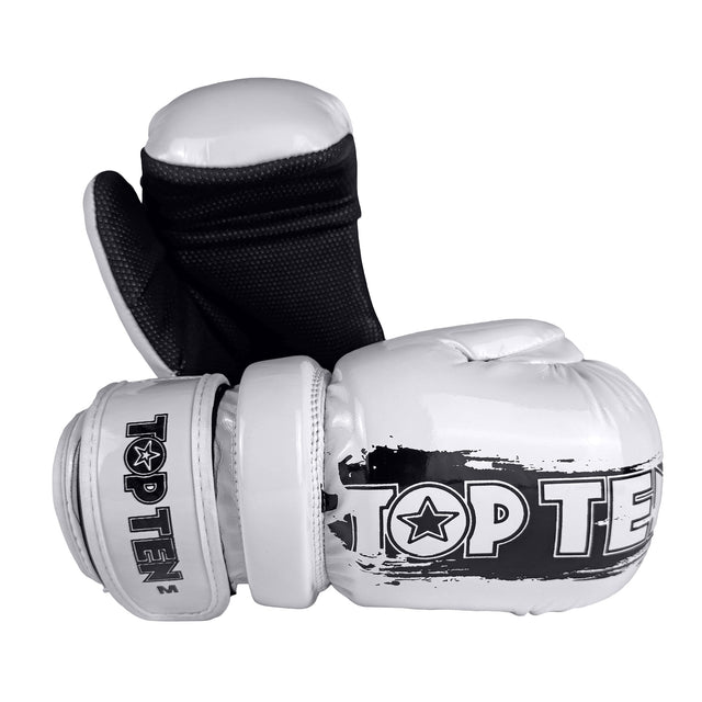 Black always works - that's why the TOP TEN Pointfighter "Power Ink BnB" do not need any other color highlights. Even the well-known TOP TEN lettering in the design of the Power Ink series remains true to this style and shines on the robust outer shell made of PU synthetic leather . The thumb is fixed with a wide band for more security, so that it cannot simply twist or be pushed backwards. In addition, the Pointfighter "Power Ink BnB" are equipped with a wrist control system . A ring of high-density molded foam surrounds your wrist, giving you more stability and dissipating impact energy. Your fingertips lie in precisely fitting straps so that your hands enjoy a perfect hold in the open kickboxing gloves . An elastic band and a strong Velcro fastener secure your TOP TEN Pointfighter "Power Ink BnB" on your hands.