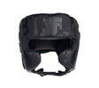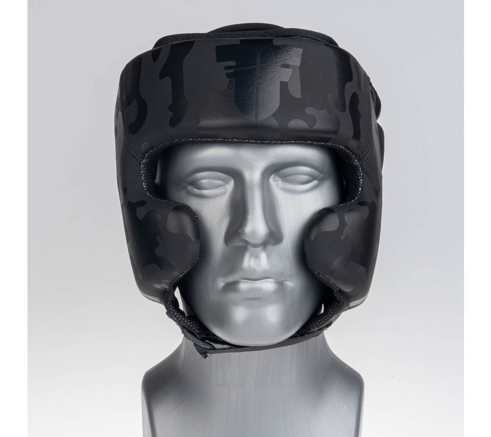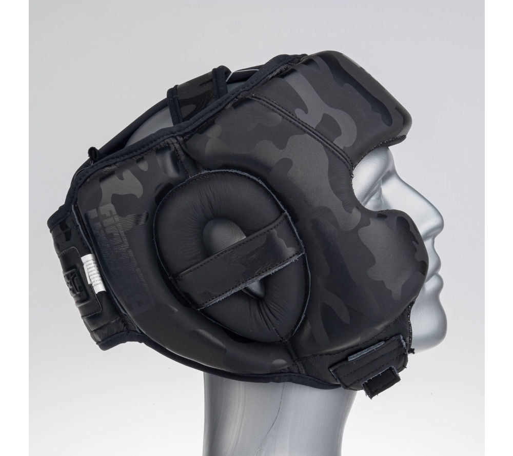 Fighter training headgear. Full grain artificial leather shell with multi-ply layered foam padding for comfort and coverage during training. Additional foams in forehead, cheeks and ears.