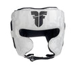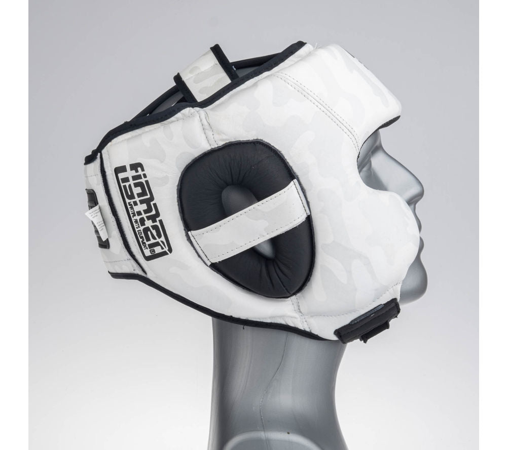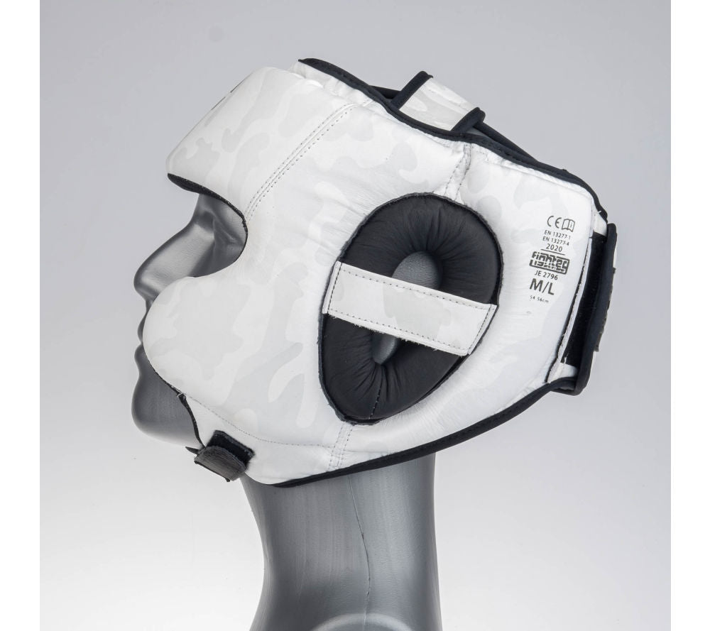 Fighter training headgear. Full grain artificial leather shell with multi-ply layered foam padding for comfort and coverage during training. Additional foams in forehead, cheeks and ears.