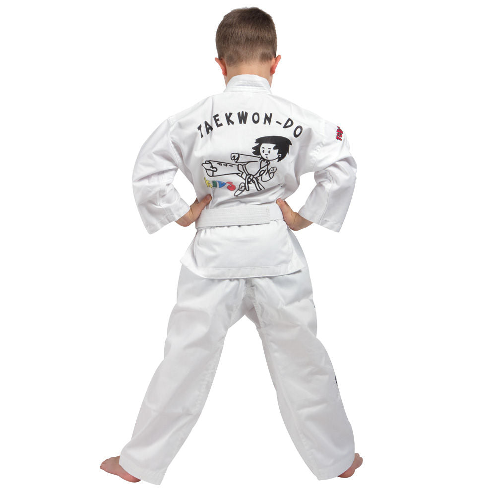 Pants are roomy with drawstring elastic waistband and gusseted to allow unrestricted use of protective cup, extensive stretching or high kicking. Additional 5 color screen printed vertical TAEKWON-DO with horizontal KiDS on right pants leg. .