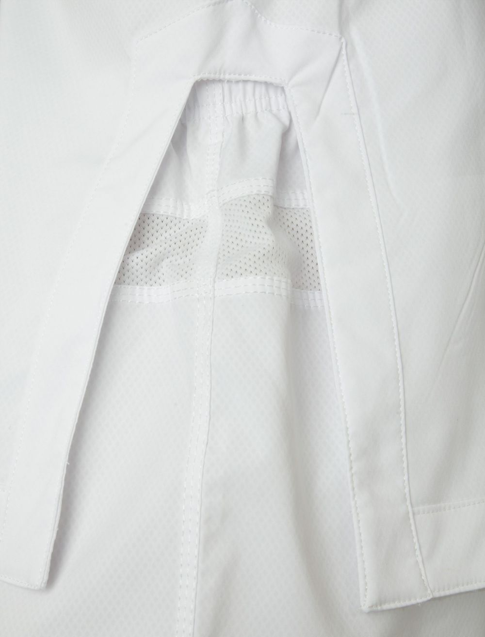 Traditional cross-over top with modern design and venting. Center stitched, no Velcro, lapel closure stays closed during training. Elastic waistband pants with drawstring and full-length wide gusseted groin for unrestricted kicking.