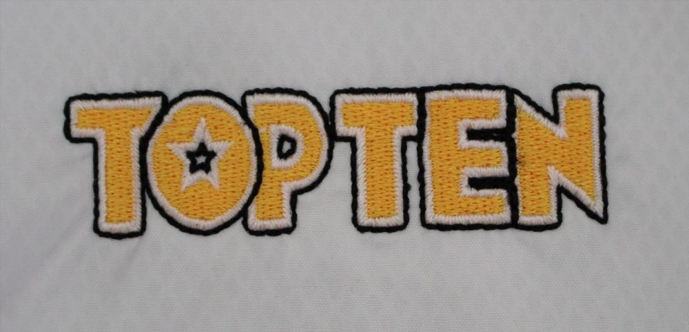 The functional “Diamond” - structure of the fabric ensures a balanced moisture management, the material is sweat repellent and fast drying. CMT - Mesh venting inserts on upper backand under armpits, as well as at the knee and waist area ensure good ventilation. High-quality seams of gloss finish stitching with Golden TOP TEN embroidery at shoulder and leg highlights make this dobok visually unique while fulfilling all requirements of the International Taekwon-Do Federation ITF. ITF Official Patch on top right side of chest with 5 color ITF logo below and semi-circular TAEKWON-DO on back with vertical Korean Hangul characters center. ITF lettering on pants knee area.